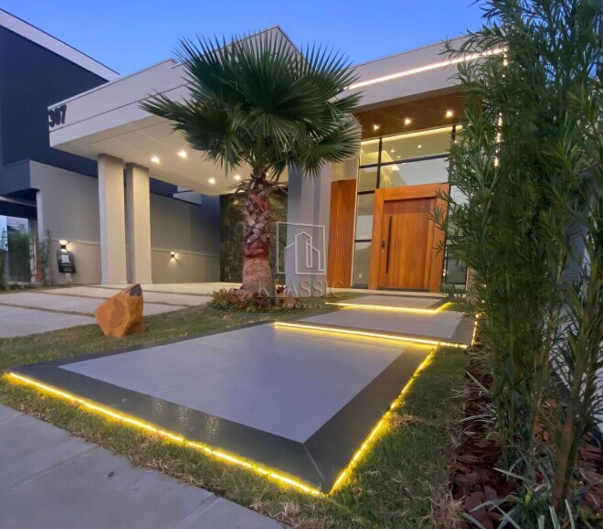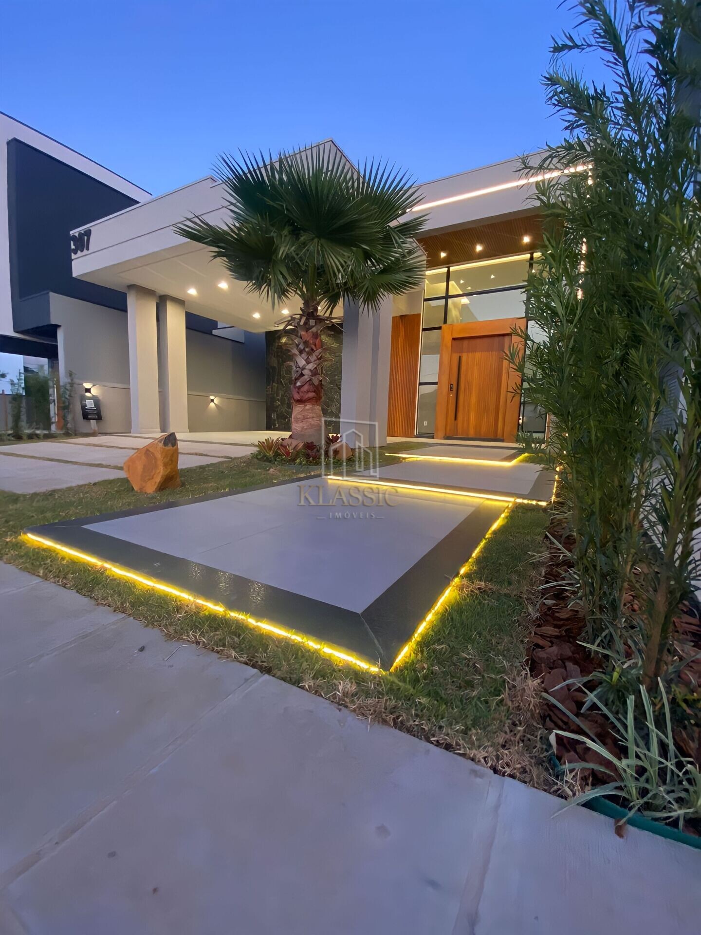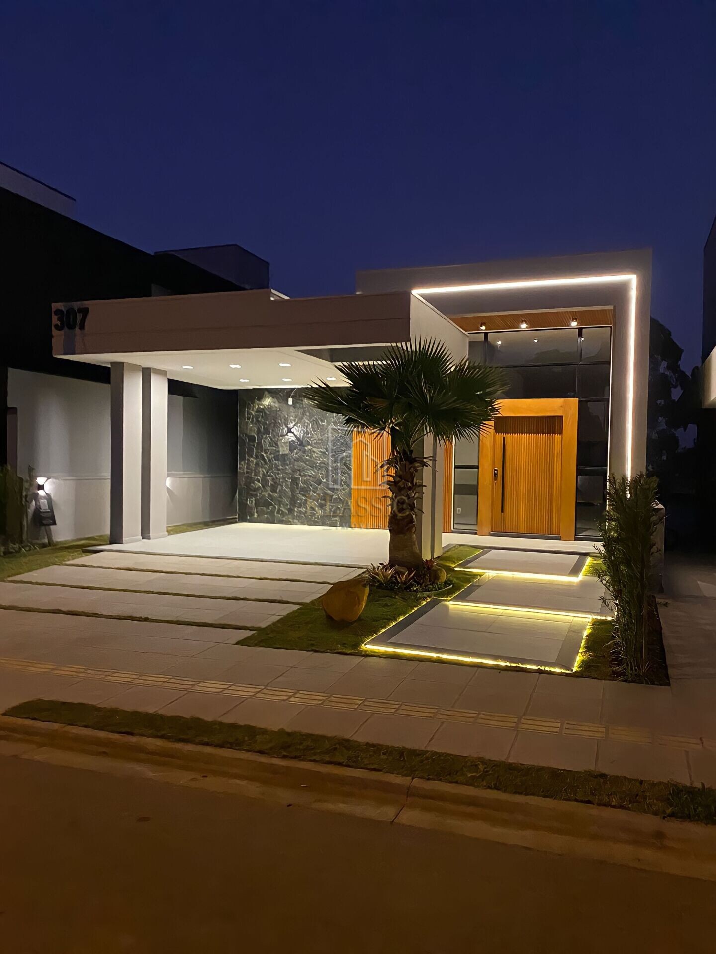 Fachada contemporânea com pedras naturais, ripado em madeira nobre e iluminação em led;