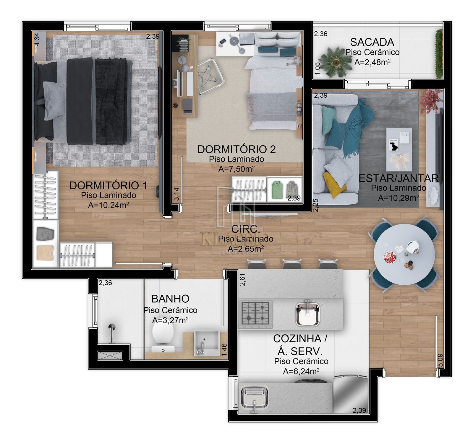 02 dormitórios, banheiro social, cozinha com azulejos, sala de estar e jantar integradas, área de serviço, louças sanitárias, sacada, entre outras características..