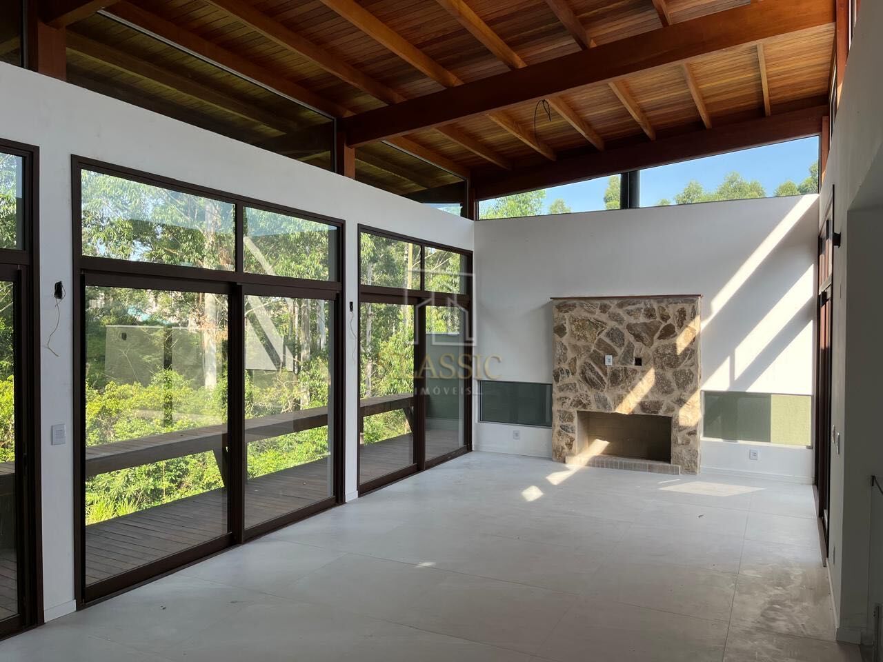 O pé-direito elevado com acabamento em madeira traz imponência, conforto térmico e excelente iluminação natural.