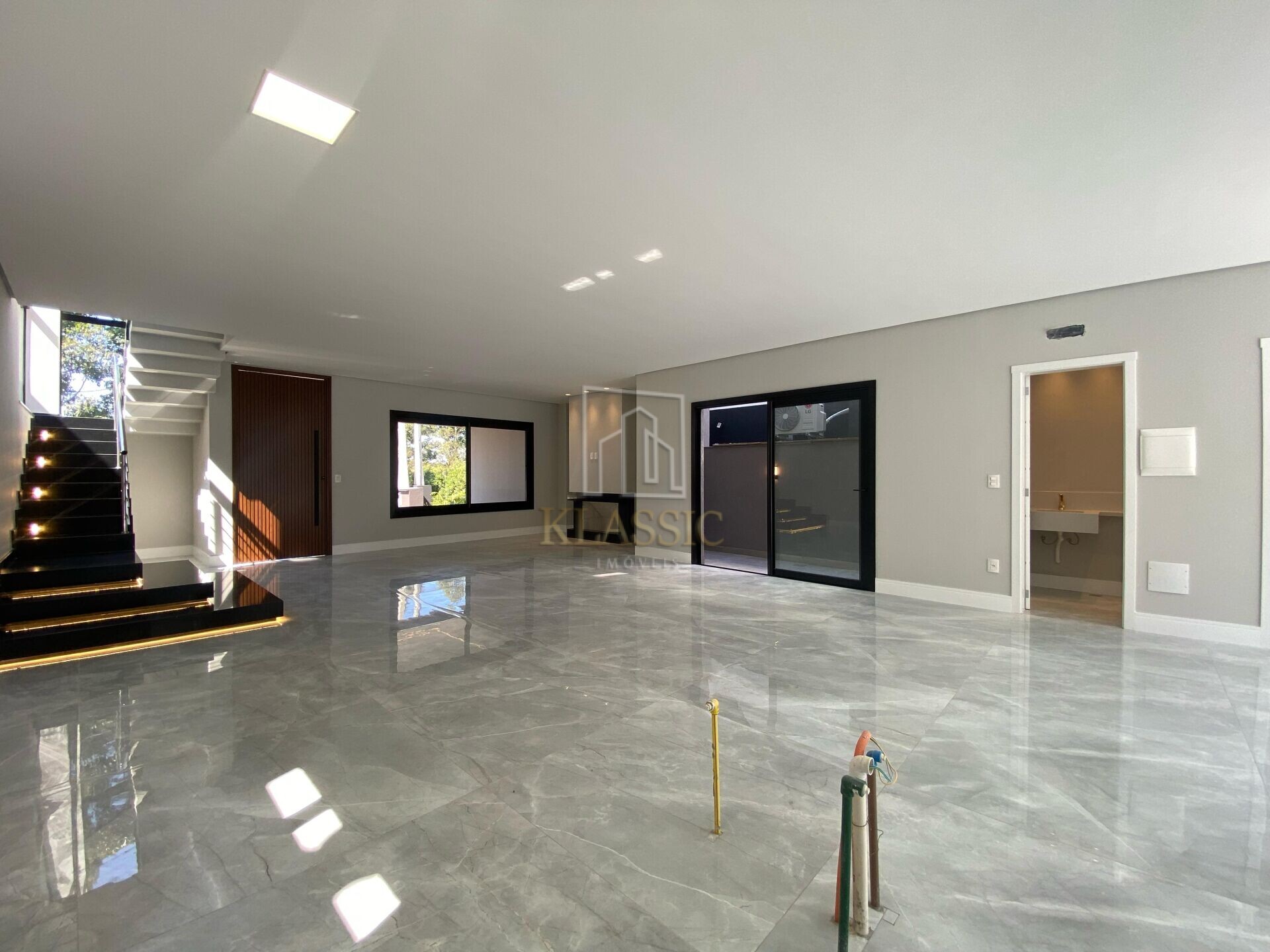 Cozinha com espera para ilha integrada com o espaço gourmet, sala de estar com lareira, sala de jantar, escada em granito com detalhe em led, porta pivotante com ripados, aberturas pretas com persianas automatizadas, piso porcelanato, gesso, iluminação toda em led, quatro vagas de garagem sendo duas cobertas, terreno plano com vista incrível para área de preservação ambiental.