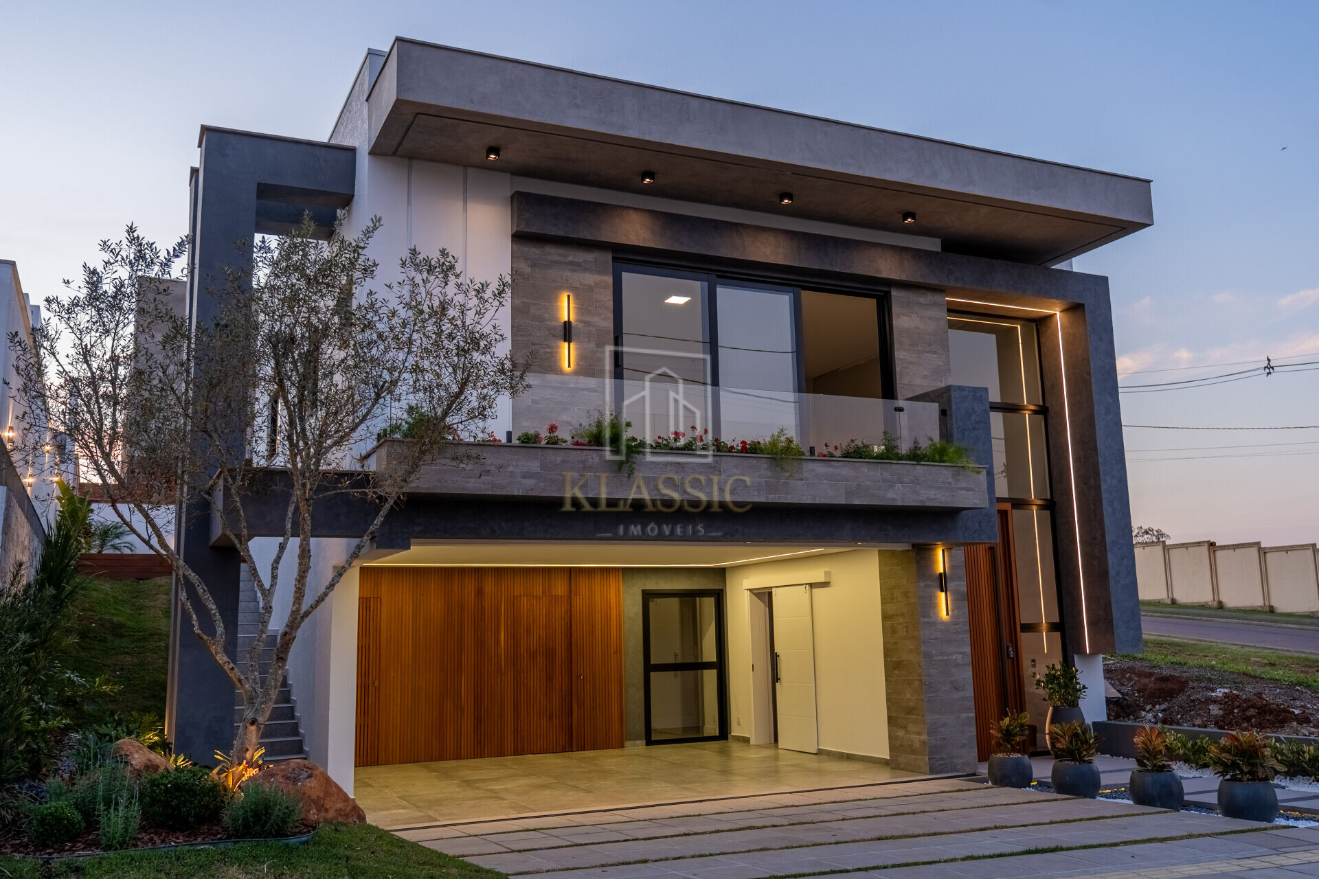 Fachada contemporânea com cimento queimado, composição de cores harmônicas, floreira suspensa, ripado em madeira nobre, revestimentos e iluminação em led;