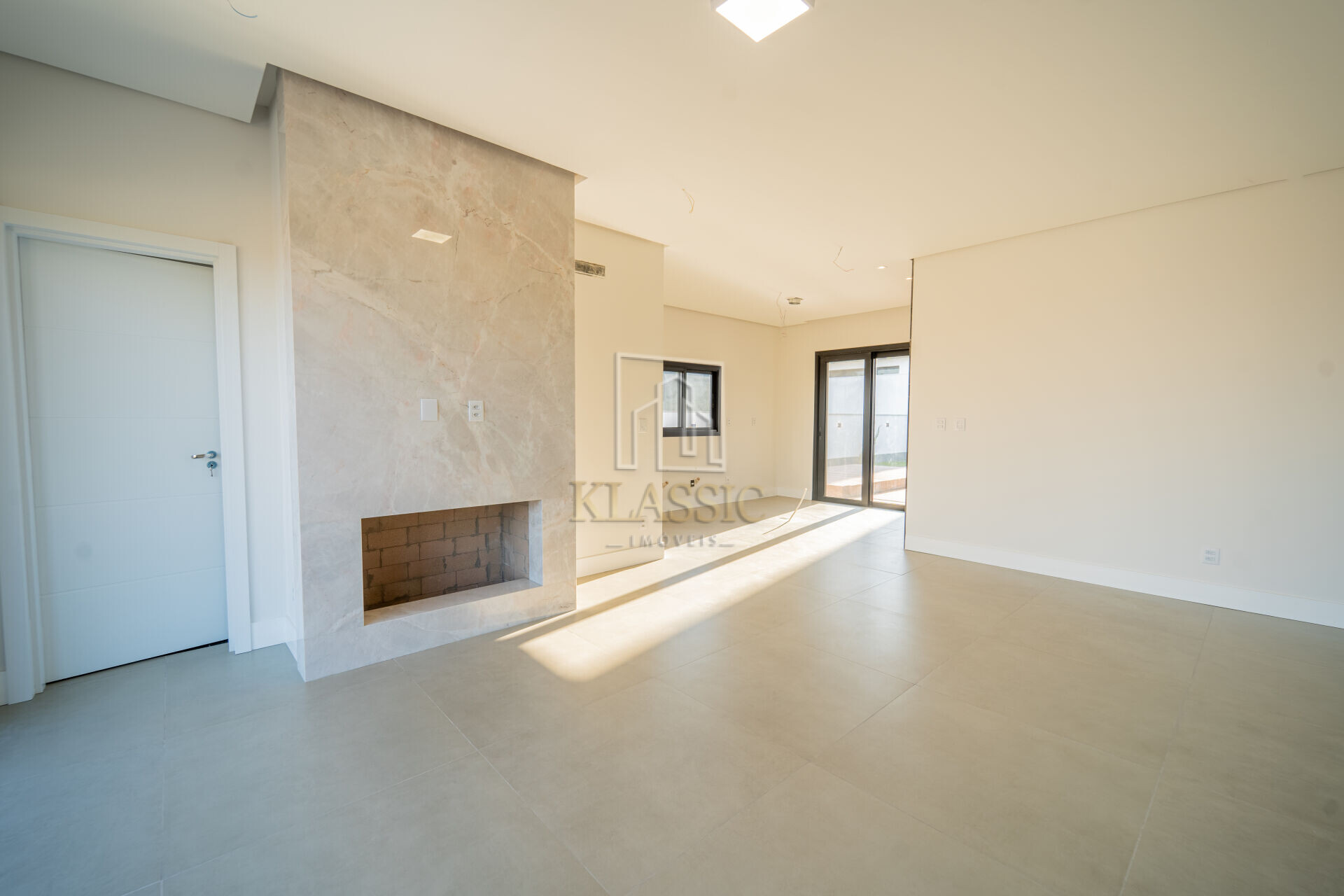 Amplo Living com lareira e sala de jantar;