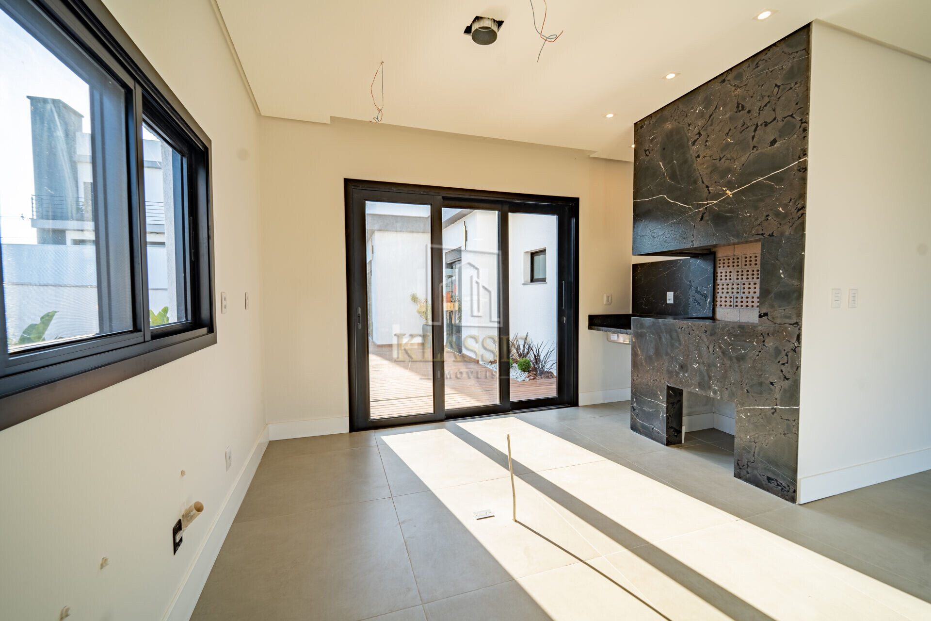 Lareira, churrasqueira e escada revestidas integralmente com granitos nobres;