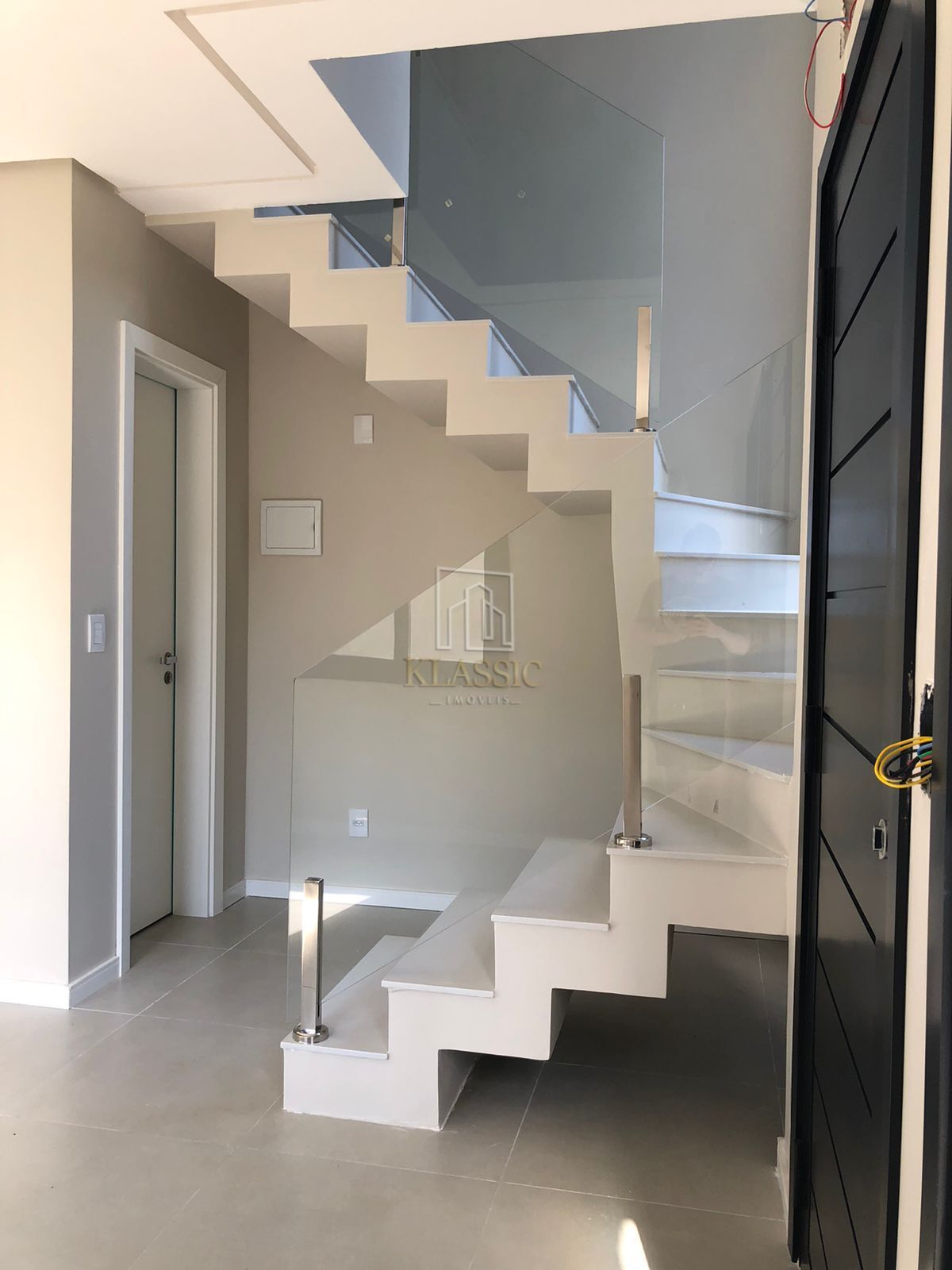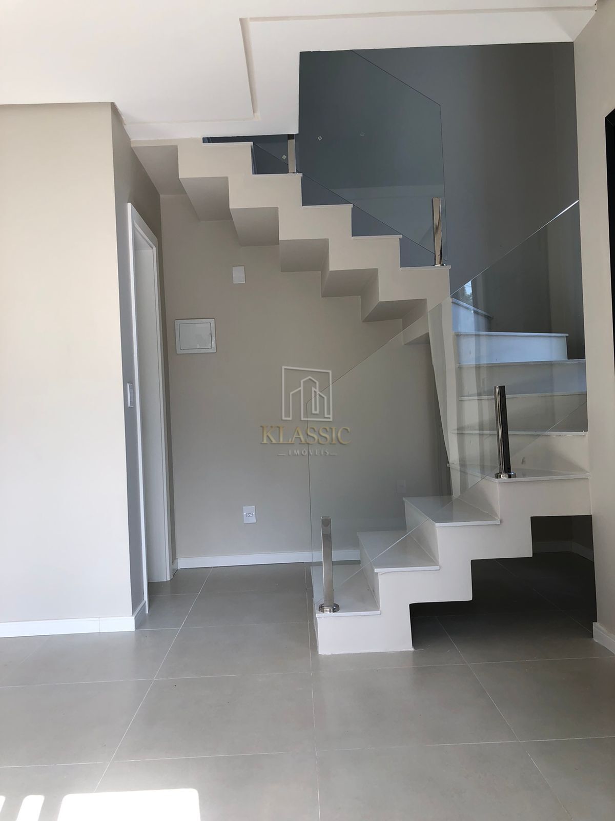 O interior conta com detalhes requintados em gesso no teto, proporcionando um acabamento refinado e moderno. A escada, um ponto de destaque, é cuidadosamente revestida em pedra natural e conta com guarda-corpo de vidro, agregando elegância e um toque de leveza ao ambiente.